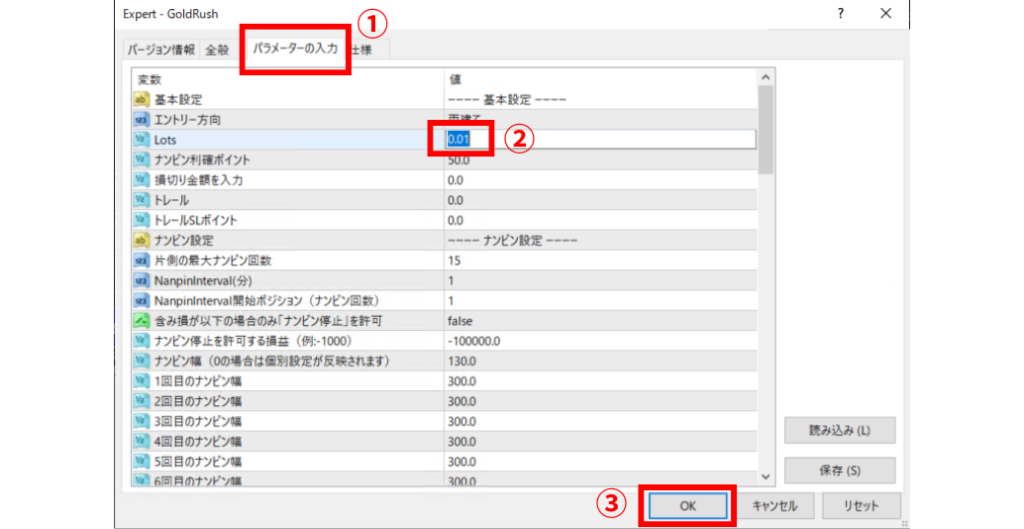 ①「パラメーター入力」を選択 ②Lotの数字を変更 ③「OK」をクリック