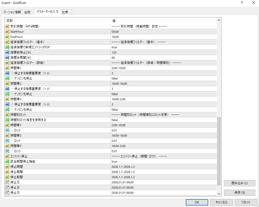 EAは自動で取引を行いますが、相場が荒れやすい期間は、EA・パラメーターに関係なく停止する方が安全です。